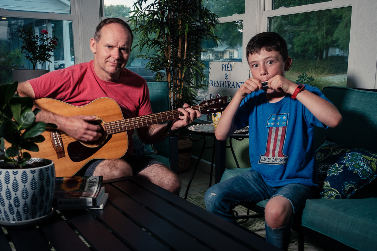 Showing my youngest a few notes on his harmonica, so he can play along.