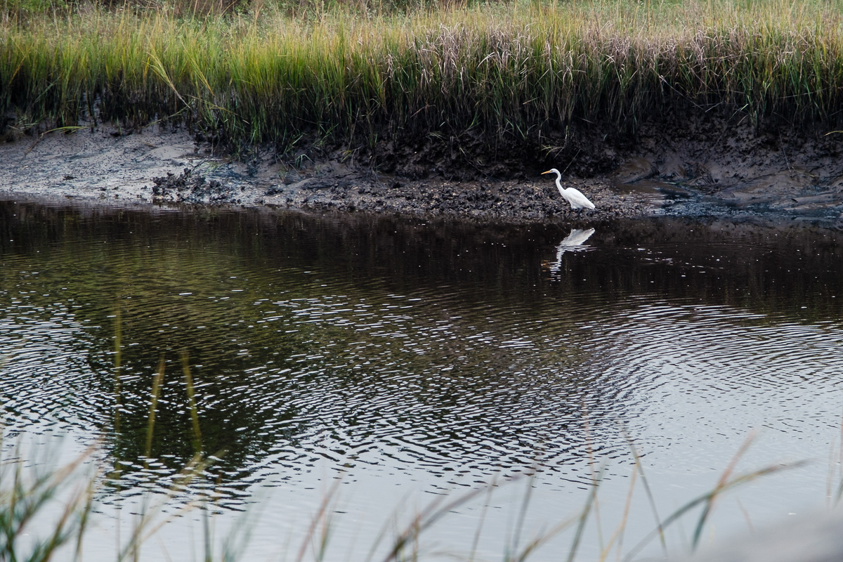 An egret catching fish at low tide in Davis Canal.